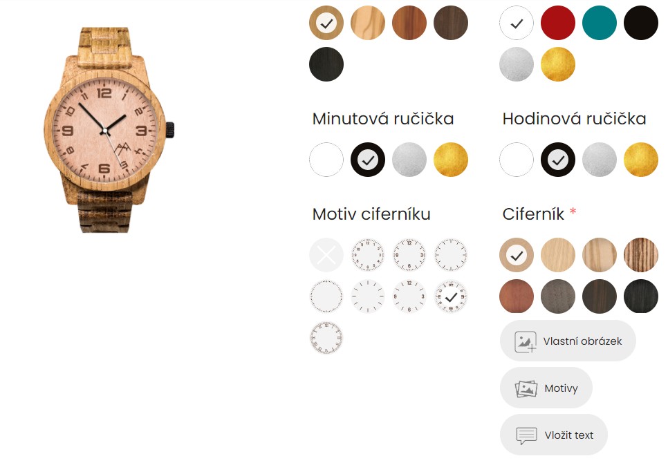Pravý sloupec nabízí kategorie komponentů, například řemínek, tělo hodinek, ručičky a další. Výběrem těchto variant dochází ke změně náhledu výrobku.