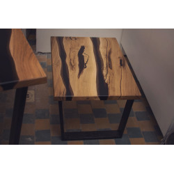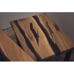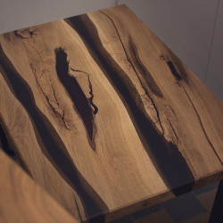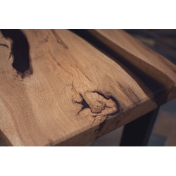Tento konferenční stůl z masivního dubového dřeva je malým, ale výrazným designovým prvkem, který vynikne v každém obývacím pokoji. Deska je zpracována s použitím dvou vrstev epoxidu – černé, která přidává eleganci, a šedoprůhledné, která zvýrazňuje přirozenou kresbu dřeva. Stůl má výrazný rustikální charakter s množstvím suků, záhybů a nepravidelností, díky kterým je každý kus naprostým originálem.