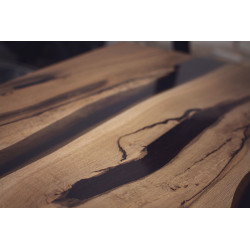 Ručně vyrobený jídelní stůl z masivního dubu. Přírodní suky a praskliny jsou pečlivě vyplněny epoxidovou pryskyřicí, která zajišťuje odolnost a jedinečný vzhled. Každý kus je originál s výraznou kresbou dřeva, vhodný do moderních i rustikálních interiérů.