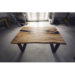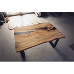 Ručně vyrobený konferenční stůl z Jilmu. Přírodní suky a praskliny jsou pečlivě vyplněny epoxidovou pryskyřicí, která zajišťuje odolnost a jedinečný vzhled. Každý kus je originál s výraznou kresbou dřeva, vhodný do moderních i rustikálních interiérů.