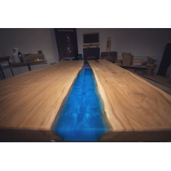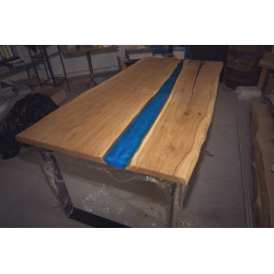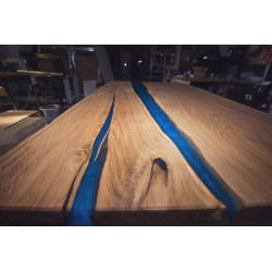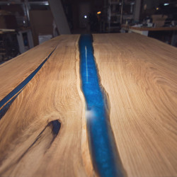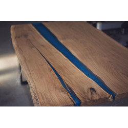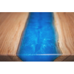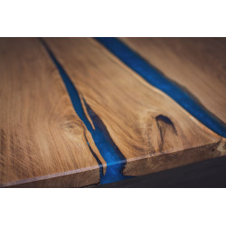 Tento jídelní stůl z masivního dubového dřeva přináší do interiéru kombinaci přírodního vzhledu a moderního designu. Deska stolu je zdobena tmavě modrým až tyrkysovým epoxidem, který připomíná barvy hlubokých oceánů. Přírodní hrany zachovávají autentický charakter dřeva a dodávají stolu unikátní vzhled.