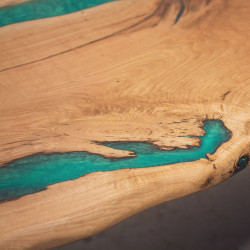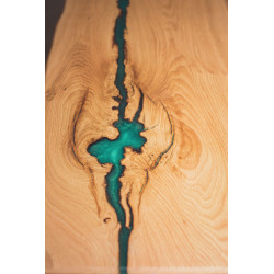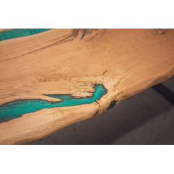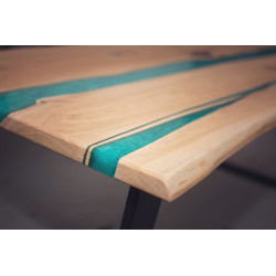 Tento jídelní stůl z masivního dubového dřeva zaujme svou přirozenou krásou a výrazným designem. Deska stolu je zdobena modrozeleným epoxidem, který přidává zajímavý barevný prvek, a zároveň zachovává přirozený charakter dřeva. Stůl vyniká výraznou kresbou, množstvím suků a nepravidelnými přírodními hranami, které zdůrazňují jeho jedinečnost.
