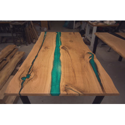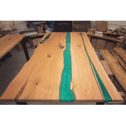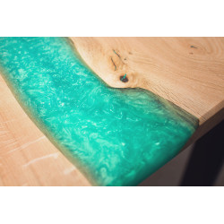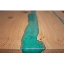 Dubový jídelní stůl s modrozeleným epoxidem a přírodními hranami