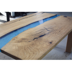 Tento konferenční stůl z masivního dubového dřeva vás zaujme svým originálním designem a přírodním zpracováním. Deska stolu je doplněna průhledným modrým epoxidem, který vytváří efekt klidné vodní hladiny a přináší do interiéru zajímavý prvek. Kombinace dubového dřeva s jemně viditelnou kresbou a modrého epoxidu působí nadčasově a moderně.