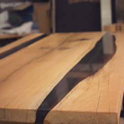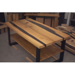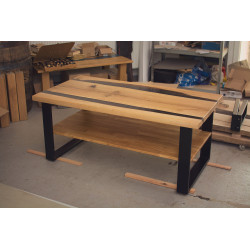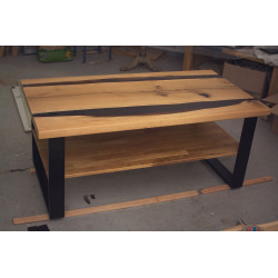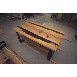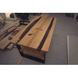 Ručně vyrobený konferenční stůl z Dubu s úložným prostorem. Přírodní suky a praskliny jsou pečlivě vyplněny epoxidovou pryskyřicí, která zajišťuje odolnost a jedinečný vzhled. Každý kus je originál s výraznou kresbou dřeva, vhodný do moderních i rustikálních interiérů.