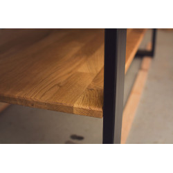 Stůl má rozměry 120 x 50 cm a výšku 40 cm, což ho činí ideálním pro konferenční stůl do obývacího pokoje nebo jiných společenských prostor. Je vybaven kovovými jeklovými nohami, které mu poskytují stabilitu a moderní vzhled. Středová část nohou obsahuje praktický úložný prostor z dubového dřeva, který nabízí místo pro uskladnění drobností a zároveň zachovává přírodní estetiku stolu.