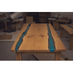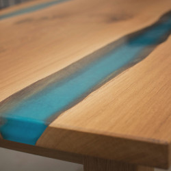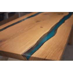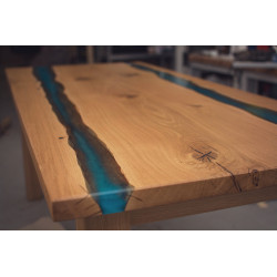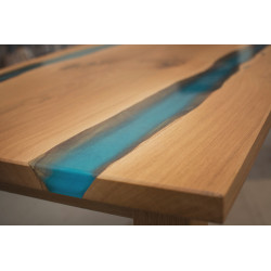 Tento dubový jídelní stůl spojuje přírodní masivní dřevo a moderní design. Deska stolu je vyrobena z kvalitního dubového dřeva, které zachovává krásnou kresbu, a doplněna bleděmodrým epoxidem, který připomíná klidnou řeku. Díky tomuto detailu stůl nejen působí zajímavě, ale zároveň přináší jedinečný prvek do každého interiéru.
